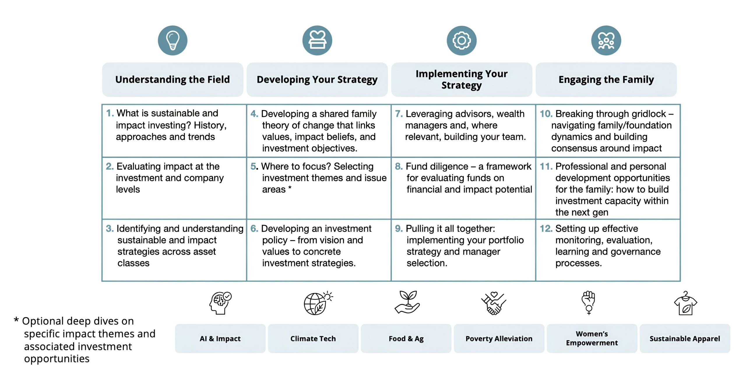 Building on Dr Gifford’s decade of teaching at Harvard, MIT and University of Zurich, we deliver tailored masterclasses, family and foundation workshops and education across all key elements of the impact investing journey.
